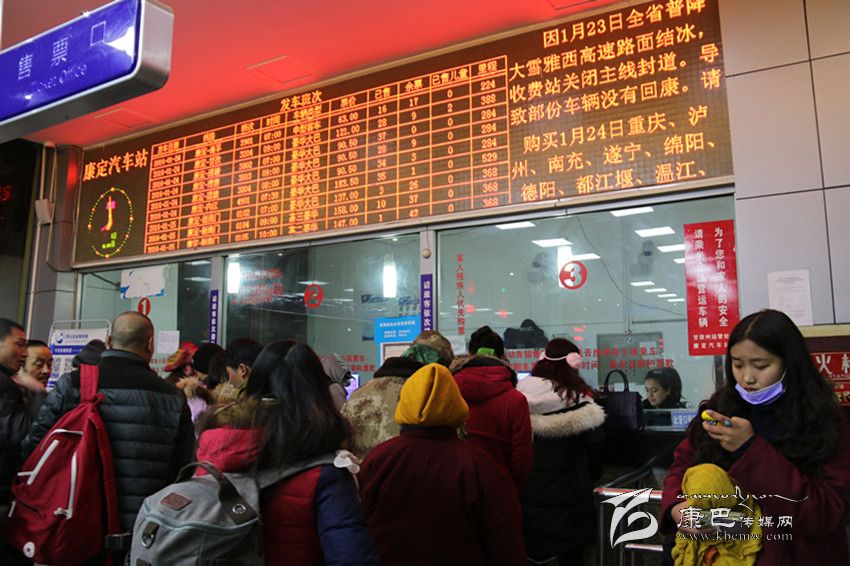 原來,汽車站售票窗口上方的視頻上滾動(dòng)播放著:“因1月23日全省普降大雪,雅西高速路面結(jié)冰,收費(fèi)站關(guān)閉主線封道,導(dǎo)致部分車輛沒有回康定。請(qǐng)購買1月24日到重慶、瀘州、南充、遂寧、綿陽、德陽、都江堰、溫江、雙流(1402次)、仁壽、眉山、西昌、宜賓、安岳、廣安的旅客到售票窗口退換車票。”