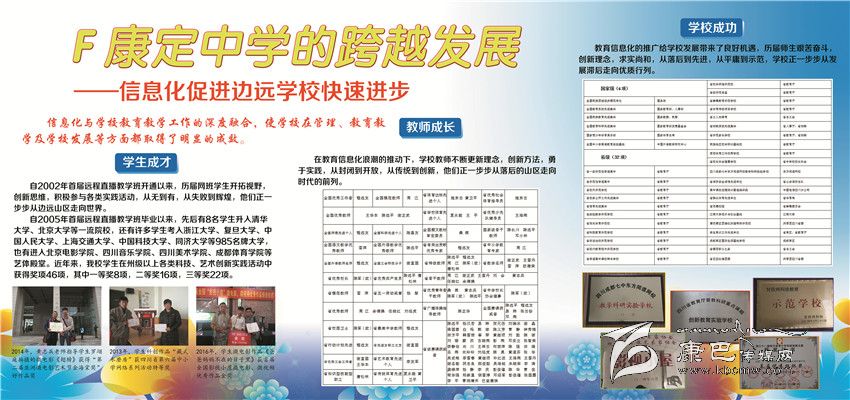 2002年以來康定中學(xué)立足民族地區(qū)教育實際,依托成都七中優(yōu)質(zhì)教育,先后開通成都七中高中直播班、初中錄播班,建成初中遠程直錄播教學(xué)AB平臺,實現(xiàn)了與國內(nèi)名校共享優(yōu)質(zhì)教學(xué)資源的目標,將網(wǎng)課教學(xué)打造成學(xué)校教育品牌。經(jīng)過近5000名師生員工的不懈努力,2013年來,康定中學(xué)連續(xù)4年高考硬上本科人數(shù)突破200人大關(guān)。先后有8名學(xué)生被北京大學(xué)和清華大學(xué)錄取。中考綜合評比連續(xù)9年保持全州第一。