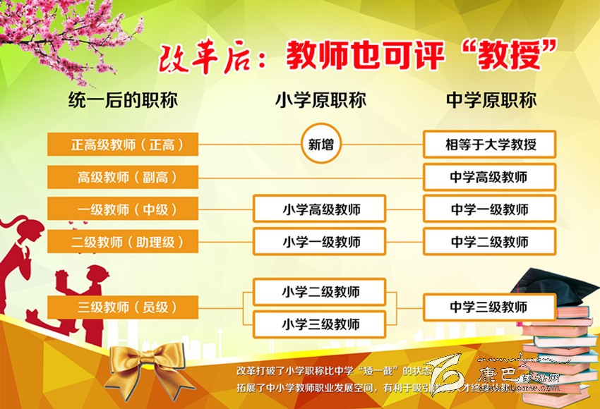 一是中小學(xué)教師職稱“天花板”被拆除,可參與全省統(tǒng)一組織的“正高級”職務(wù)評定;評定后,工資、福利待遇與大學(xué)正教授等同。此項在此次改革中最受關(guān)注。