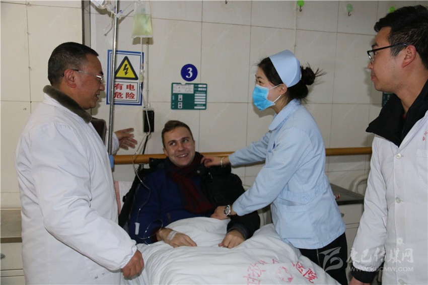 和國醫(yī)生正在給臨床病人檢查病情。一位來康定玩的俄羅斯小伙因患重感冒住進了急救中心。正在輸液的他用比較熟練的中文激動地告訴記者:“這里的醫(yī)生服務(wù)很好,他們過年都沒有休息,我得了重感冒,經(jīng)過治療以及在他們的細心關(guān)照下,我的病情好多了?!?/span>