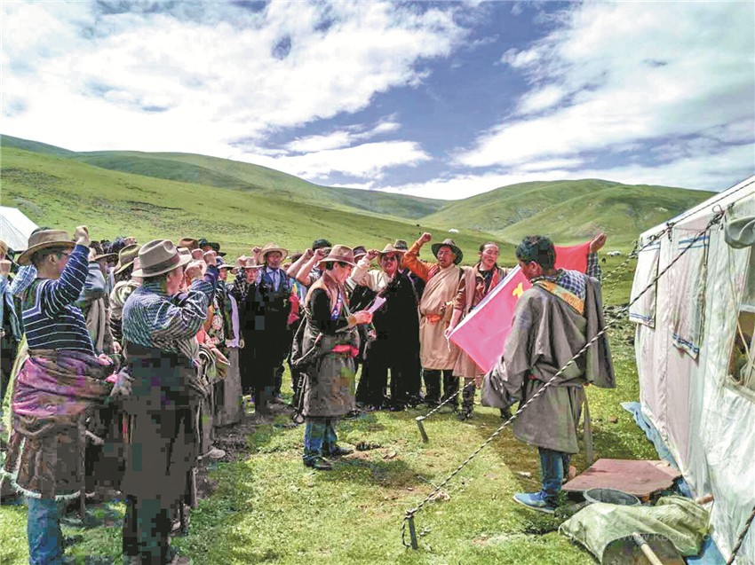 牧民黨員在帳篷前重溫入黨誓詞。