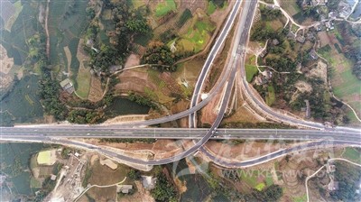 上午11時(shí)許,當(dāng)記者驅(qū)車到達(dá)對(duì)巖樞紐互通立交,用無(wú)人機(jī)從空中俯拍,這個(gè)縱橫交錯(cuò)、恢弘磅礴的交通樞紐,宛如盤旋在云端的銀龍,又似在大地上延伸的血脈,其造型、規(guī)模、結(jié)構(gòu)都令人嘆為觀止。