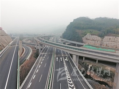 道路兩旁山嶺逶迤,觸目所見(jiàn)的高速公路,幾乎全都搭建在山腰帶際之間,如同蒼山綠水上的一條“彩練”。山河與路橋隧的錯(cuò)落有致,車上的人便更有一種與藍(lán)天白云的距離越來(lái)越近的錯(cuò)覺(jué)。沿線綠化因地制宜,打造水體山體景觀,“車在路上行,路在景中生,人在畫中游”的美感油然而生。