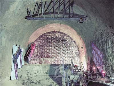 隧道式錨碇建設(shè)運用系列實用型發(fā)明創(chuàng)新,發(fā)掘有利條件,利用瀘定隧道橫洞,采用平移系統(tǒng)安全、高效地轉(zhuǎn)運鋼拉桿;進(jìn)入隧道錨工作區(qū)域后,在洞內(nèi)安裝纜索吊裝系統(tǒng)進(jìn)行鋼拉桿安裝,安裝過程中通過人工配合手拉葫蘆進(jìn)行精確微調(diào),實現(xiàn)了高強度鋼拉桿在狹窄、封閉的錨洞中的轉(zhuǎn)運、安裝和精確定位。