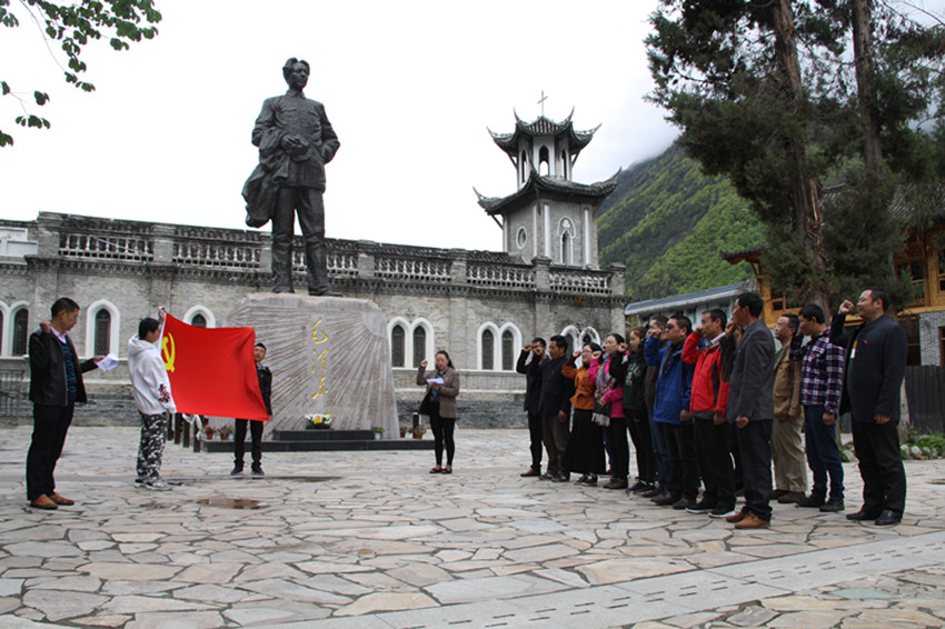 本網(wǎng)訊 (本網(wǎng)記者 秦松 攝影報道)日前,甘孜日報社全體黨員與群眾工作全覆蓋結(jié)對共建共創(chuàng)的海螺溝燕子溝鎮(zhèn)的躍進(jìn)坪村支部、南門關(guān)村支部、麻柳林村支部、喇嘛溝村支部的黨員,懷著崇敬的心情來到磨西長征紀(jì)念館毛主席塑像前,舉行緬懷革命先烈、重溫入黨誓詞活動?;顒又?,黨員們還與共建共創(chuàng)支部黨員進(jìn)行了座談。圖為宣誓活動現(xiàn)場。