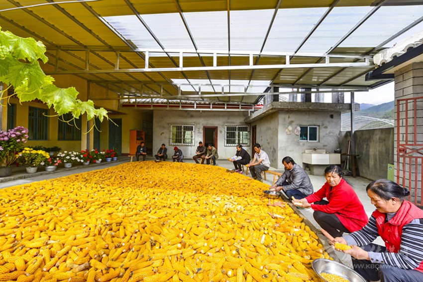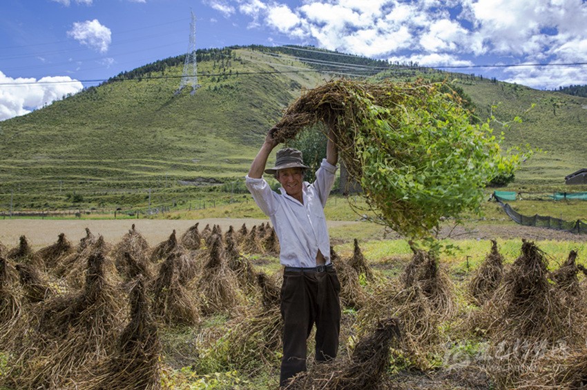 村民收豌豆。