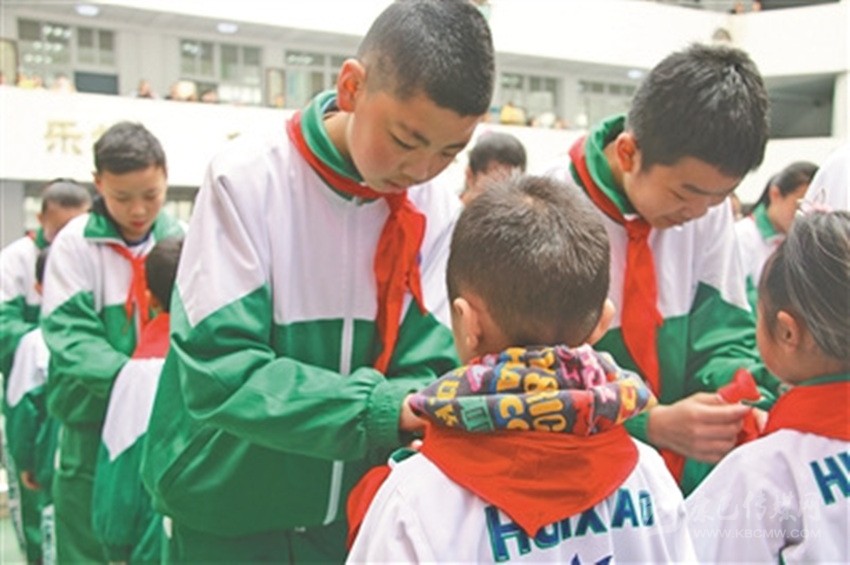 康定市回民小學(xué)六年級學(xué)生為新入隊(duì)學(xué)生佩戴紅領(lǐng)巾。