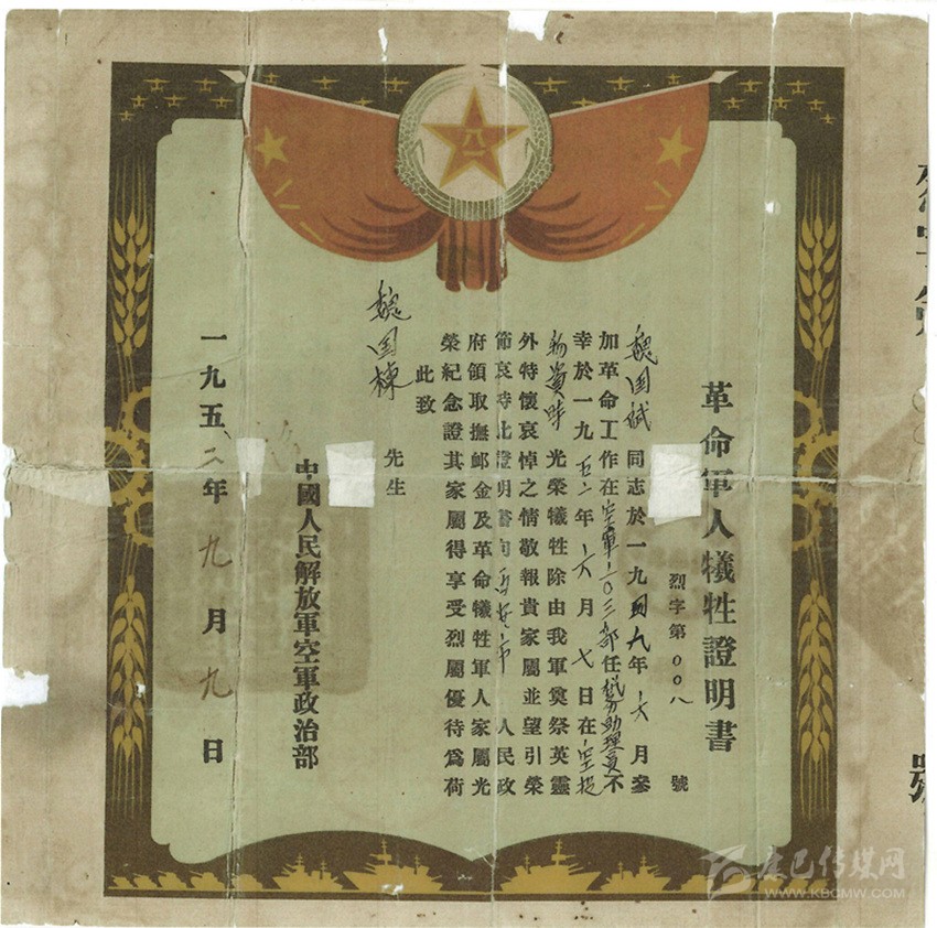 但《革命軍人犧牲證明書》上卻是字字泣血的消息:魏國斌(魏國賓)同志不幸于1952年6月7日執(zhí)行西線任務(wù)空投物資時(shí)光榮犧牲。