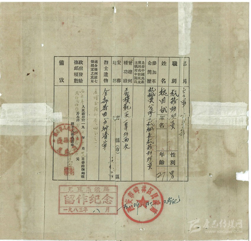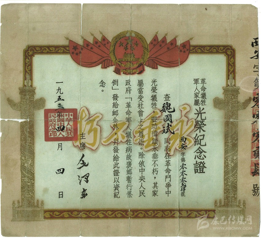 魏國賓革命犧牲軍人家屬光榮紀(jì)念證。