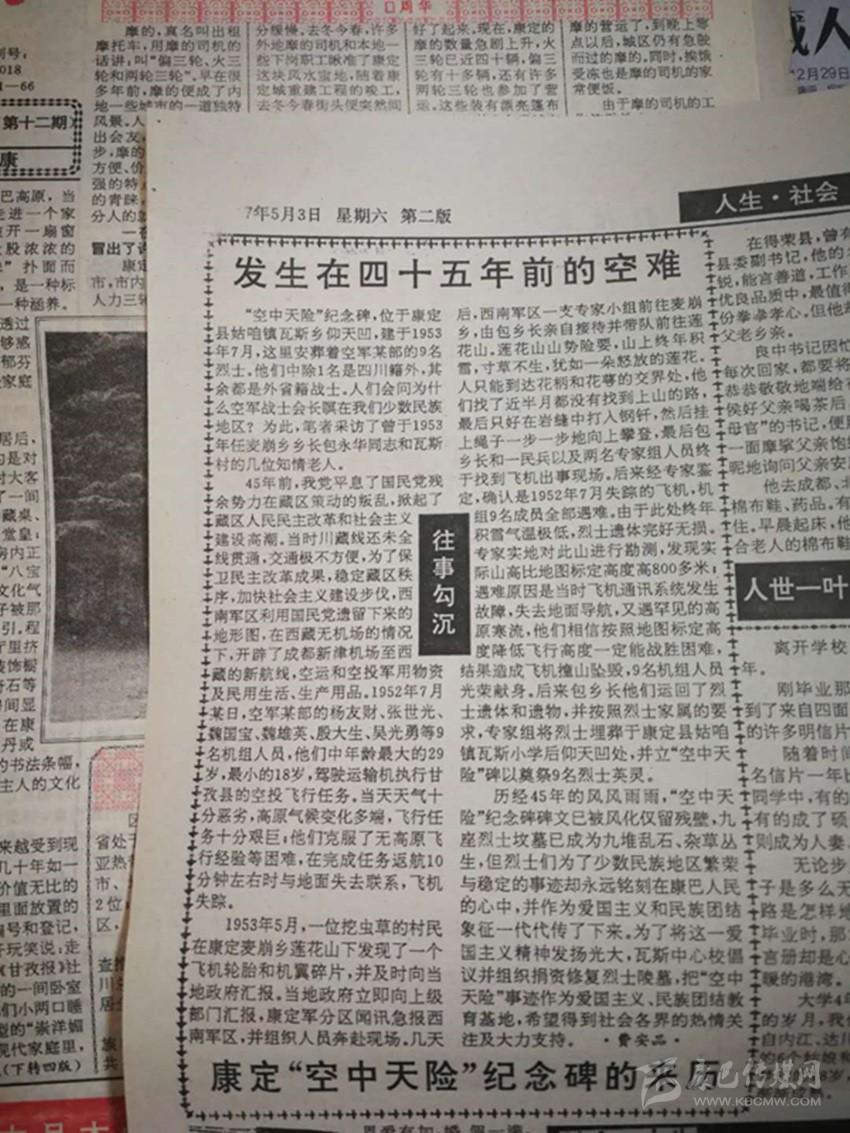 《甘孜日報(bào)》1997年5月3日第二版刊登了《發(fā)生在四十五年前的空難——康定“空中天險(xiǎn)”紀(jì)念碑的來歷》一文,詳細(xì)記錄了1952年空軍某部9名人員駕駛運(yùn)輸機(jī)執(zhí)行空投飛行任務(wù),不幸在康定地區(qū)撞山墜毀,英勇犧牲的故事。這9名烈士后被當(dāng)?shù)厝罕姲苍?,建立“空軍墓”和“空中天險(xiǎn)”紀(jì)念碑。 作為烈士犧牲地的甘孜多年來一直在尋找這9名烈士家屬,以圖告慰英靈。但由于線索有限,一直未有結(jié)果。