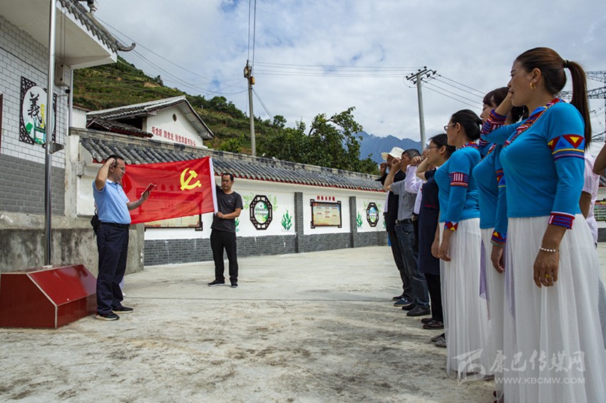 在建黨98周年來臨之際,王昇帶領全村共產(chǎn)黨員、入黨積極分子和幫扶單位瀘定縣民政局部分黨員一起重溫入黨誓詞。