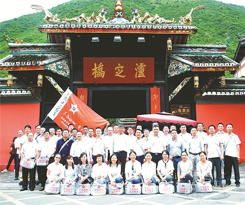 四川省委黨?!安煌跣?牢記使命”主題教育培訓班在瀘定橋頭合影。
