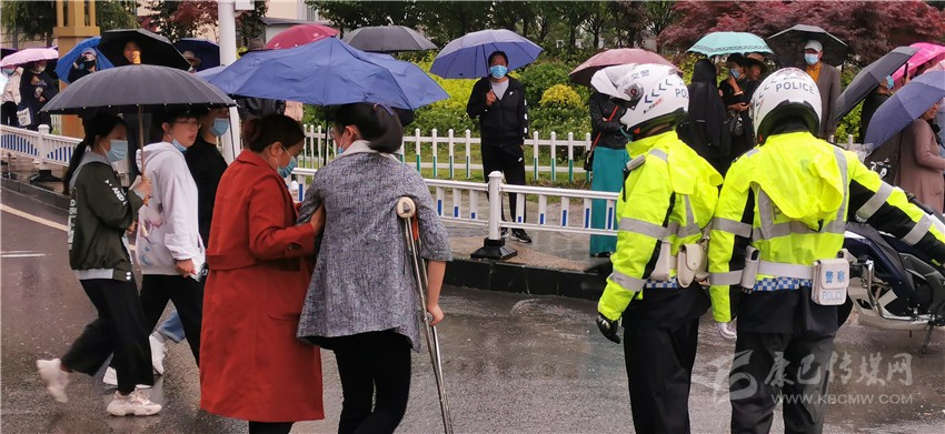 這邊剛幫助考生尋回遺失的準(zhǔn)考證,那邊一名杵著拐杖的考生引起了執(zhí)勤交警的注意,這時(shí)這名考生在家長(zhǎng)的攙扶下正準(zhǔn)備過馬路,交警見狀,立即上前為其疏導(dǎo)交通,開辟出綠色通道。記者了解到,這名考生叫段尚玲,兩周前意外摔傷了腿,這給她的應(yīng)試之路帶來(lái)了不少麻煩,幸好在交警的幫助下,她安全順利地進(jìn)入了考場(chǎng)。