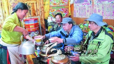 位于宗塔草原“大盆地”東邊山坡的降巴牧場(chǎng)在隊(duì)員們的心里也留下了深刻的印記。15日早上5點(diǎn)半隊(duì)員們就出發(fā)上了降巴牧場(chǎng)。朝霞映紅了天邊,紅云罩著青草牛糞味飄香的草坡。比采風(fēng)隊(duì)員們起得更早的牧人已擠完了牛奶,一個(gè)僅10 歲的女孩正在草坡上拾牛糞;牛毛帳篷里,勤勞的牧婦已打開了牛奶分離器開始分離酥油了……一問,方知牧民們今晨4點(diǎn)就起床勞作,干完早上的活兒,他們要趕到三公里遠(yuǎn)的“盆地”耍壩子,看賽馬。這個(gè)牧場(chǎng)靜謐潔凈得令人稱奇,青青的草坡上絕少有垃圾存留,沒見到一只兇惡的牧犬;按季節(jié)劃分的草場(chǎng)由整潔的網(wǎng)圍欄圈開,分隔有致;牧人舉家出門,連帳篷門也不掩,據(jù)說這里沒有偷盜發(fā)生,家人和諧;古老、平和的氣氛中,晨風(fēng)輕拂,野花青草搖曳,輕柔的晨霧中偶而傳來兩聲牛哞,讓人頓感心靜如水。對(duì)于長期居住城市的人來說,這里無疑是“幽雅天堂”了。