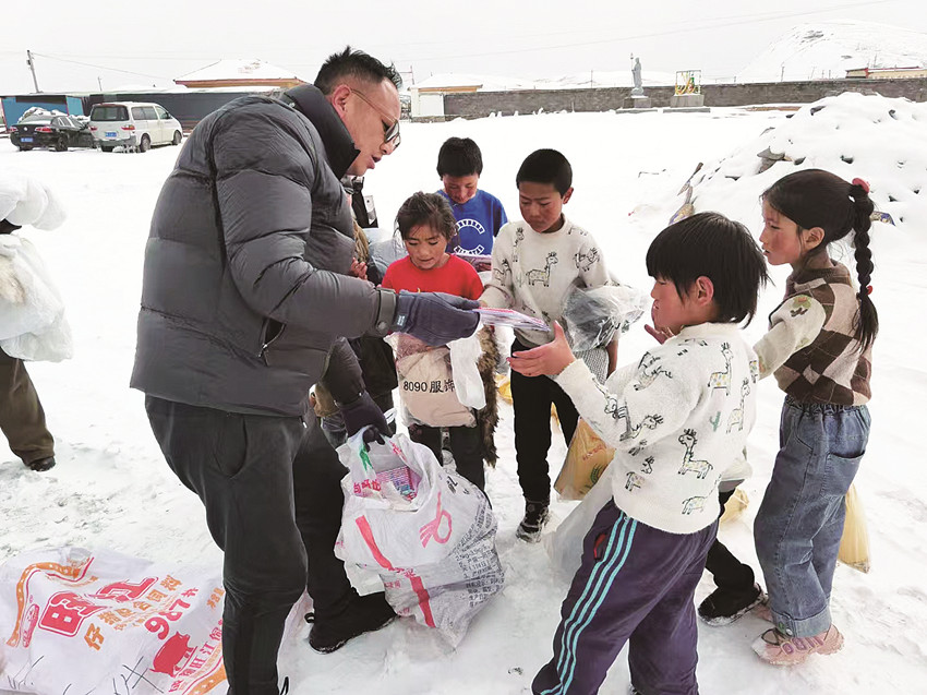 普布澤仁為家庭困難兒童送去學(xué)習(xí)用品。