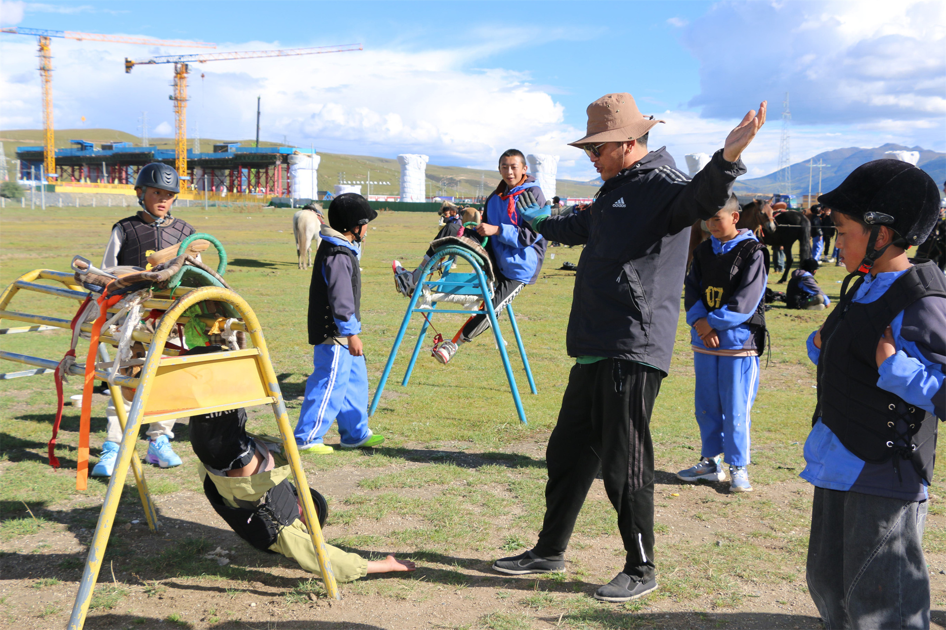 圖為參加教學(xué)活動(dòng)的中小學(xué)生正在進(jìn)行模擬騎馬訓(xùn)練。