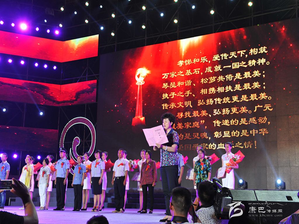 8月31日晚,廣元市隆重舉行“向幸福出發(fā)——尋找最美家庭”家庭文化才藝展演活動暨頒獎典禮。我州丹巴籍農(nóng)婦滕德芬作為20戶廣元市“最美家庭”之一,登臺領(lǐng)取了“最美家庭”榮譽證書。圖為省婦聯(lián)副主席張懷青致頒獎詞。