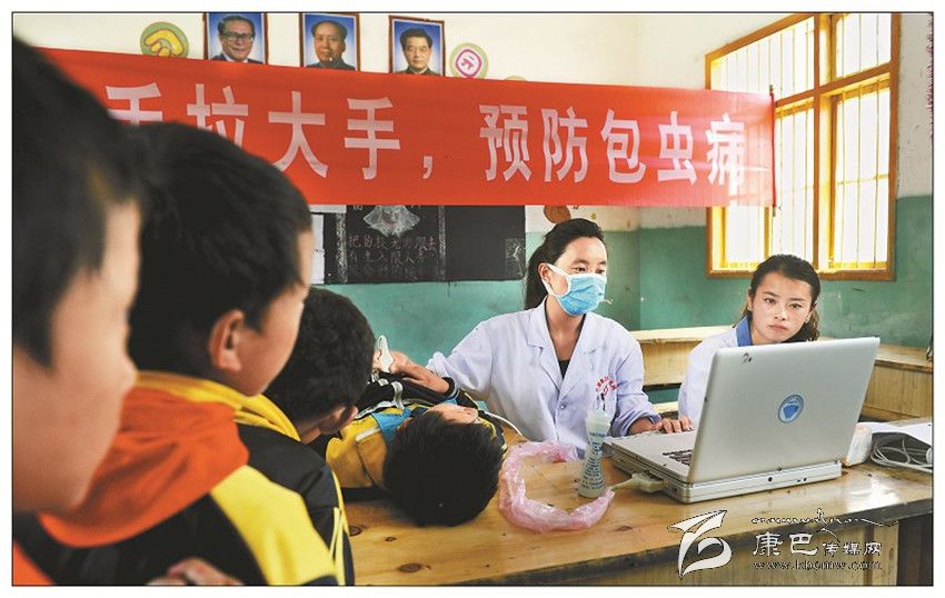 高原防控——醫(yī)務人員在預防包蟲病現(xiàn)場為學生檢查身體。