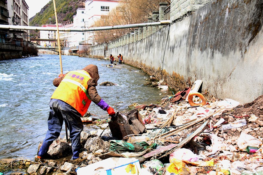 “康定城區(qū)河道中垃圾遍布,有的淺灘甚至就像一個小型垃圾場,對水質(zhì)乃至城市形象都有負面影響”,康定市水務(wù)局工作人員羅布鄧珠向記者大倒苦水,“這些垃圾都是人為因素造成的,清運河中垃圾甚至成為我們的‘常態(tài)化’工作。而盡管我們采取多種方式對折多河?xùn)|關(guān)迎賓大道至康定中學(xué)河道沿線巡視,集中打撈、及時清除河段、沿岸堆積的垃圾雜物,但因為仍然不斷有人向河中扔倒垃圾,河道整體環(huán)境衛(wèi)生質(zhì)量沒有達到預(yù)期的整治效果。”