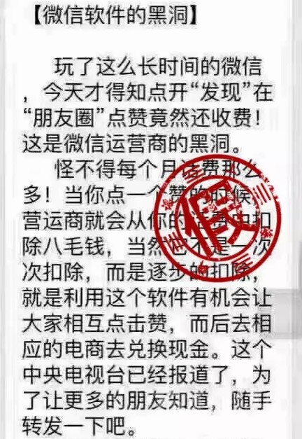 近日,微信群中流傳一條消息稱:“玩了這么長時間的微信,今天才得知點贊竟然還收費。當(dāng)你點一個贊的時候,運營商就會從你的話費中扣除八毛錢……中央電視臺已經(jīng)報道了。”