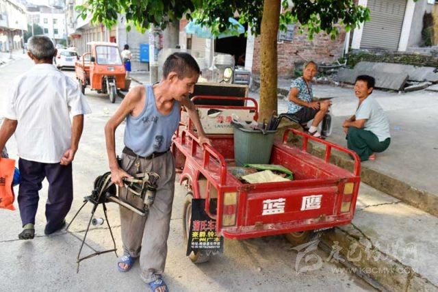 8月15日清晨不到7點,在四川省南部縣中心鄉(xiāng)漏米巖村,周強善正將補鞋工具搬上機動三輪車,準備從家出發(fā)去鄰近的長坪鎮(zhèn)集市趕場。攝影 張可凡