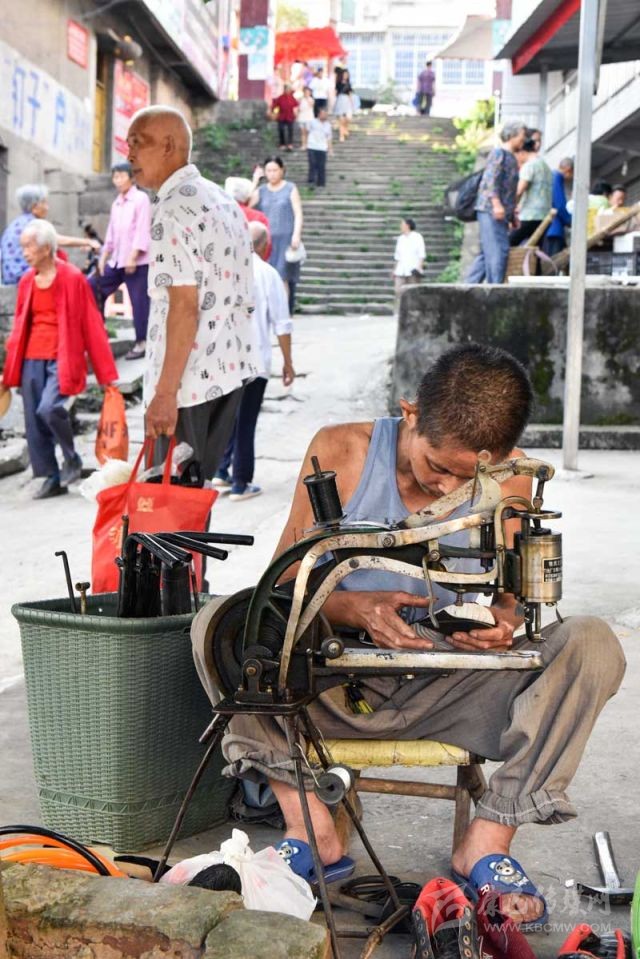 8月15日,南部縣長坪鎮(zhèn)文化街,正在補鞋的周強善。攝影 張可凡