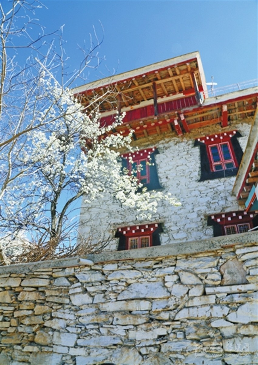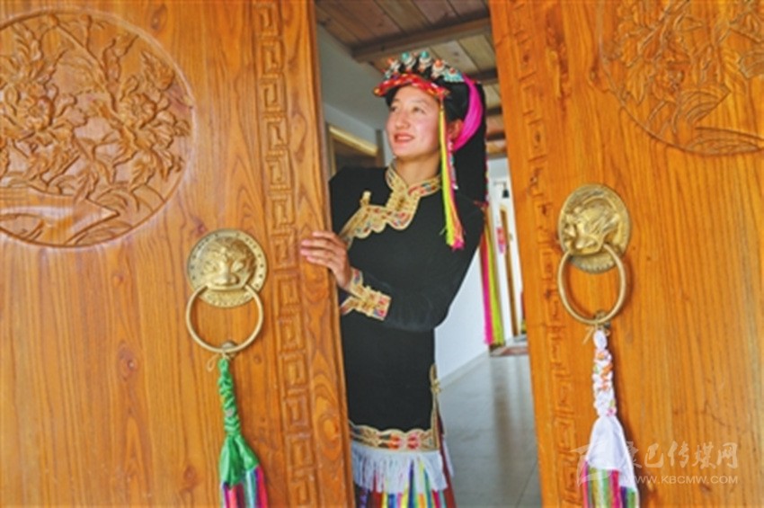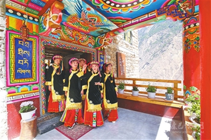 步入藏寨,藏式花紋的窗欞外懸掛著火紅的辣椒和金黃的玉米。朱紅色的大門上刻著藏式圖騰,客廳里色彩鮮艷、雕龍畫鳳的藏式餐桌上則擺滿了當?shù)厥a(chǎn)的時令瓜果。室內(nèi)房間干凈整潔,有寬大的床鋪、客廳和洗手間,手捧香甜的酥油茶,倚窗而立,樹葉隨風(fēng)擺動,似乎在訴說著少女心中對外面世界的向往。