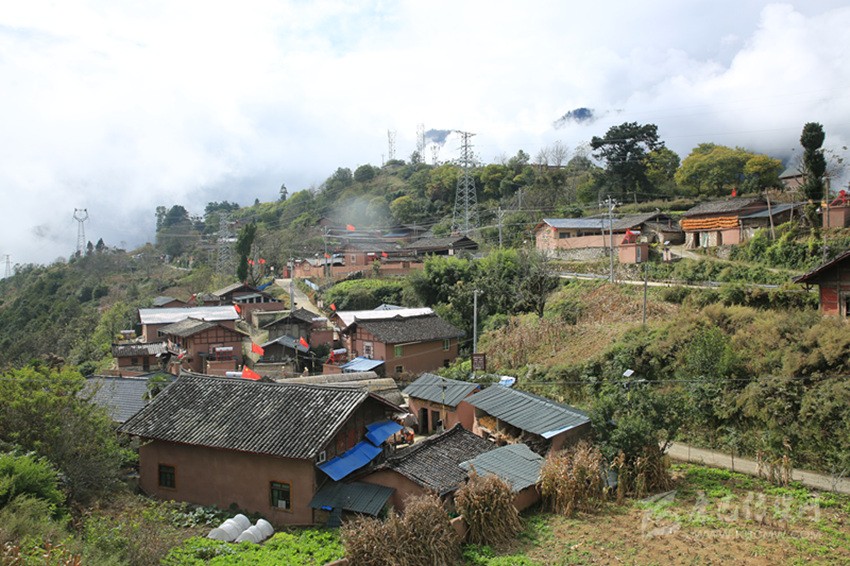 從磨西鎮(zhèn)盤旋而上,行七公里多路,一個手可觸摸藍(lán)天白云、紅旗迎風(fēng)招展的山崗便是磨崗嶺村。磨崗嶺村曾經(jīng)是紅軍長征路過的一個彝族村莊,一路上有標(biāo)示牌指明當(dāng)年紅軍走過的線路。到磨崗嶺村口,便能一覽眾山?。捍蠖珊恿飨蜻h(yuǎn)方,磨西鎮(zhèn)就在眼前。更讓人驚喜的是,村莊遍插紅旗,點(diǎn)綴在山間的屋角青瓦或是裊裊炊煙之中,紅色文化包圍著你、浸染著你。