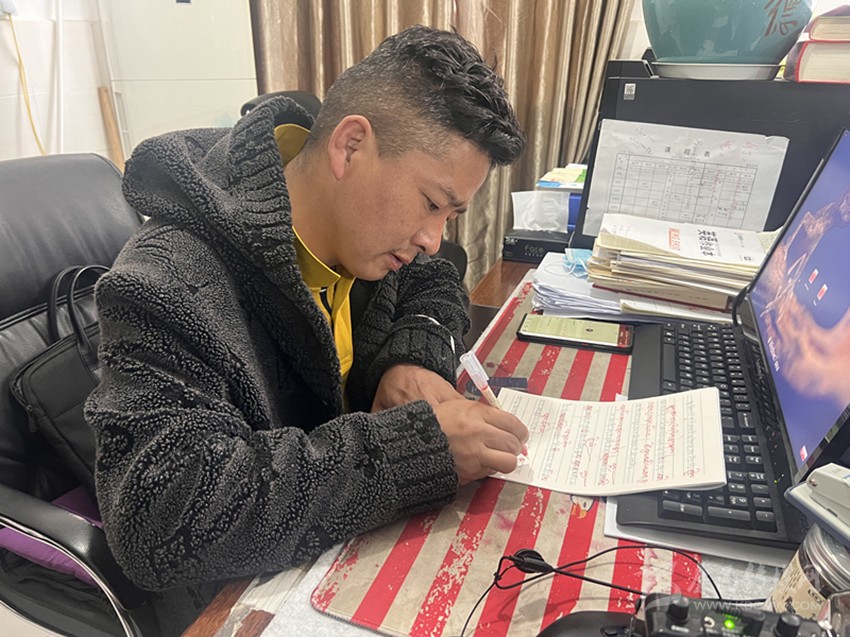 “尼瑪老師不僅對(duì)學(xué)生的學(xué)習(xí)生活關(guān)懷備至,作為任課教師,我們常??吹剿谛菹r(shí)間認(rèn)真?zhèn)湔n。他會(huì)聲情并茂地大聲誦讀精心準(zhǔn)備的課件,大家都覺得很有趣,學(xué)生學(xué)習(xí)的積極性也提高了。他批改作業(yè)也非常認(rèn)真,給每一位同學(xué)寫的評(píng)語都用心用情。他是真的是用全部身心來對(duì)待工作,不愧是一名優(yōu)秀的老師?!辈稍L過程中,筆者偶遇了援建教師廖俊希,談起對(duì)章拉尼瑪?shù)挠∠螅慰∠5脑u(píng)價(jià)細(xì)致而中肯。