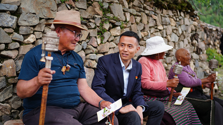 朱楠在理塘縣木拉村走訪群眾,宣傳存款保險(xiǎn)服務(wù)。
