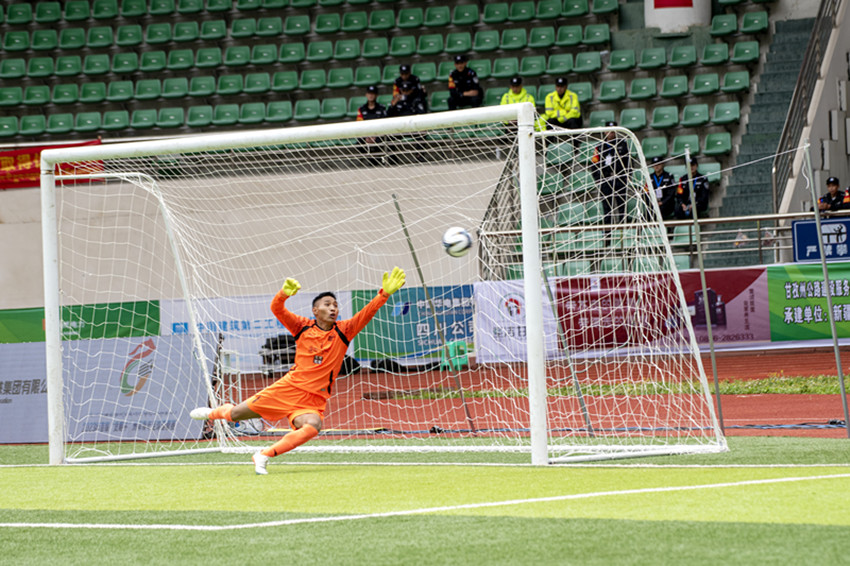 隨著主裁判吹哨發(fā)令,身穿白色球衣的甘南隊(duì)及藍(lán)色球衣的昌都隊(duì)球員各赴站位,迅速進(jìn)入狀態(tài)。上半場,甘南隊(duì)積極拼搶、快速進(jìn)攻、精準(zhǔn)傳球,很快主導(dǎo)場上局勢。而昌都隊(duì)雖后防穩(wěn)健,進(jìn)攻則顯得略為保守。第9分鐘,甘南隊(duì)員在大禁區(qū)前沿帶球晃過昌都隊(duì)員后,雙方爭奪激烈,甘南隊(duì)員倒地,裁判鳴哨,甘南隊(duì)獲得前場任意球機(jī)會(huì)。在此前比賽中已打入2球的33號(hào)球員索南道吉站上罰球點(diǎn),短暫調(diào)整后打出一記弧線球,昌都隊(duì)門將撲救不及,足球應(yīng)聲入網(wǎng),甘南隊(duì)取得1:0領(lǐng)先。