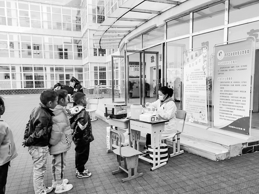 圖為醫(yī)護(hù)人員到學(xué)校開展預(yù)防接種工作。