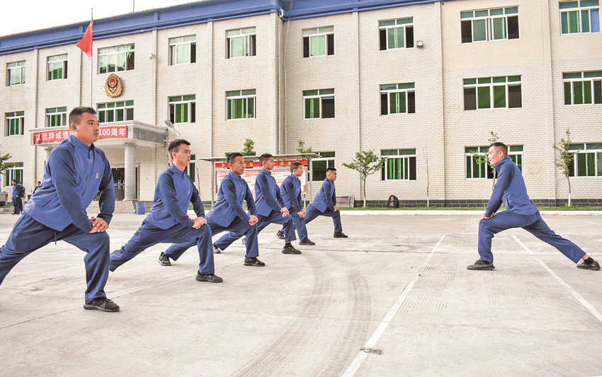 張大雄在帶領(lǐng)中隊人員開展體能訓(xùn)練。