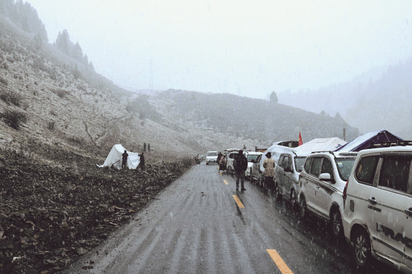 然而,高原的天、娃娃的臉,說變就變。剛剛還艷陽高照的晴好天氣,瞬間寒風(fēng)四起,鵝毛大雪不一會便覆蓋了整個山野。由于到達(dá)蟲草采集點還需4、50分鐘人力轉(zhuǎn)運物資,受天氣影響,前行受阻,擔(dān)任護(hù)送任務(wù)的民輔警當(dāng)即幫助群眾搭建臨時安置點,風(fēng)雪中警民互助的身影像極了一家人。一切收拾停當(dāng),盡管風(fēng)寒雪大,條件艱辛,樂觀的群眾和伴隨服務(wù)的民輔警還不忘在風(fēng)雪中來一張合照,他們說,這是歷年來的慣例,每次上山采集蟲草和下山返程,他們都會一個不少地拍張“全家?!?,以此留念蟲草季警民相依的美好記憶。