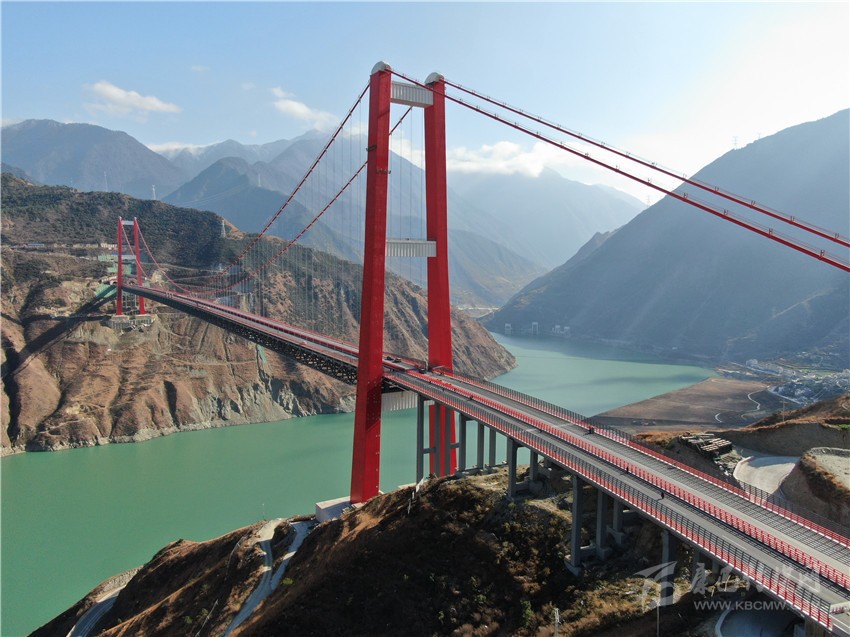 而瀘定大渡河大橋作為雅康高速全線“一橋一隧”重點(diǎn)控制性工程之一,是一座建設(shè)在高海拔、高地震烈度帶、復(fù)雜風(fēng)場(chǎng)及溫度場(chǎng)環(huán)境下的超大跨徑鋼桁梁懸索橋,全橋長(zhǎng)1411米,主跨1100米,橋面至大渡河水面239米,被譽(yù)為“川藏第一橋”。
