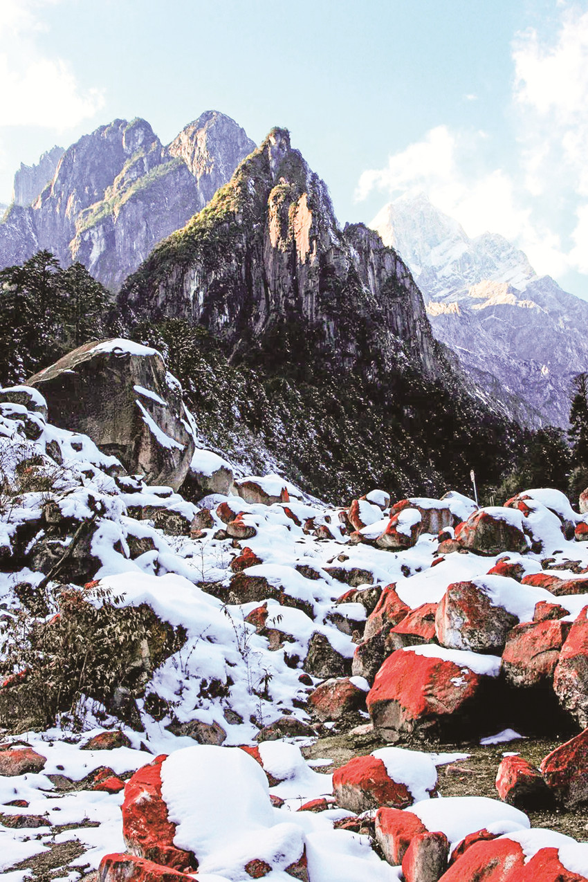 雪山、藍天白云和黨嶺村的彩林構(gòu)成一幅優(yōu)美的畫卷。新華社 發(fā)
