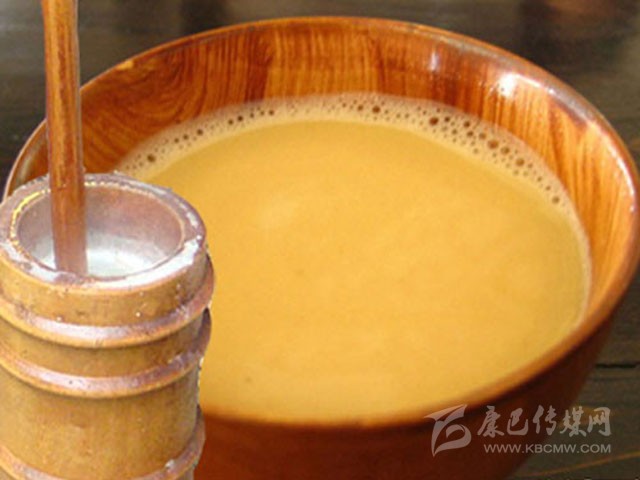 酥油茶是藏族群眾每日必備的飲品。是西藏高原生活的必需。寒冷的時候可以驅(qū)寒;吃肉的時候可以去膩;饑餓的時候可以充饑;困乏的時候可以解乏;瞌睡的時候,還可以清醒頭腦。藏民們?nèi)粘V谱魉钟筒钑r一般使用磚茶,需要時用刀切削一小塊備用。然后在鍋中加300毫升水煮沸,加3到5克碎磚茶,煮到茶水變黑熄火。茶水變色后,可加入0.5克鹽。如果天氣寒冷的話還可以多加一些鹽。最后,再加入2克酥油(約湯匙的三分之二)。飲用時將酥油茶經(jīng)過濾網(wǎng)注入茶壺中再倒進小茶杯飲用。