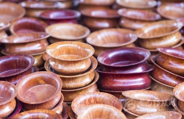 按藏族傳統(tǒng),一般人使用得最多的餐具是木碗。木碗一般用樺木、雜木雕琢而成,質(zhì)地結(jié)實,不易破裂,花紋細膩,較為美觀。木碗的制作過程,一是選材,二是風(fēng)干,三是制坯,四是細磨,五是上色。藏族木碗可分為大碗、小碗、蓋碗、套碗、木缽等多種,用途廣泛,可供喝茶,吃糌粑,存放食品、香料、佐料等,而且還具有光滑、細致、美觀、適用、不變味、喝茶香、攜帶方便等特點。雜木碗還有防毒的優(yōu)點。至于純金、純銀做成的勺子、筷子、碗和盤,雖然在民間也能見到,但畢竟不是被普遍使用的生活用品,一般給客人奉茶都使用瓷碗。