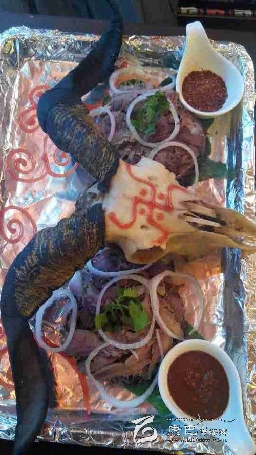 最值得一提的應該是兩盤放在羊頭邊上的蘸料。一盤是四川的干辣椒面,里面放了鹽、味精、花椒,是大部分人都能接受的口味。而另一盤辣椒是西藏獨有的藏式辣椒醬,該辣椒的香辣和印度魔鬼椒有得一拼。藏式辣椒是使用涼水調和而成,只放一些鹽在里面,用羊頭肉沾上那么一點放在嘴里,立刻能感覺到辣味直襲你的味蕾神經進入你的大腦,形成一個字“辣”。如果你是不怕的,喜歡吃辣的食客,不妨試試這道“吉祥羊頭”帶給你的火爆。