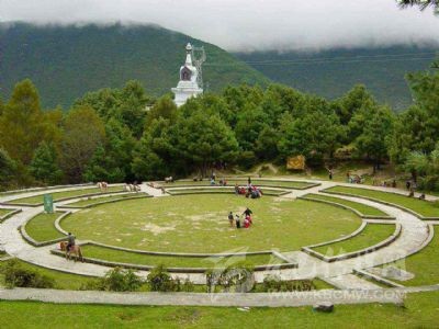 從康定城看跑馬山,景點林立,令人心馳神往。半山腰有長廊掩映在翠綠之中,引人注目。跑馬山腳有環(huán)山公路,自清真寺對面小巷拾級百余步,即至環(huán)山公路上山處,踏上水泥石階,蜿蜒林中石徑數(shù)百步,就看到飛云長廊了。迎面是陡立的寬約2米的石階。階頭,一對石獅踞于兩旁,笑迎足乏游人。入長廊在欄桿前坐下小憩,心神大爽,倦意全消。長廊依山巖建筑,大紅柱子撐起長廊的幽雅舒適,如入西湖曲廊回環(huán)中。再往下就是城中的高樓大廈以及彩虹橋、將軍橋和下橋了。爐城新姿及繁華,盡收眼底。晨夕,常有云霧來此流連而后離去,遇到云霧時,游人會有仿佛在蓬萊仙境之感。